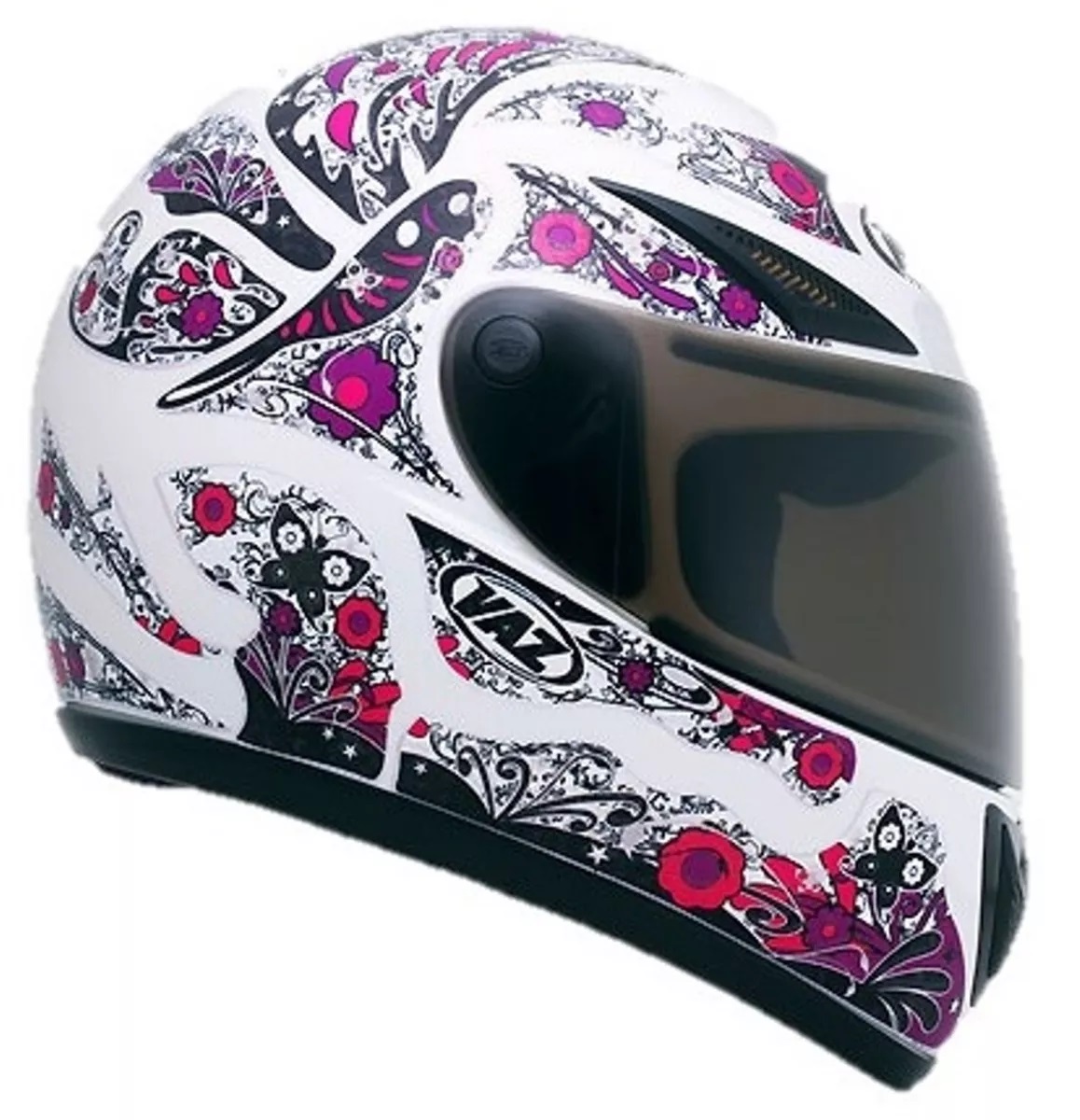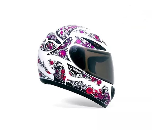 Versão especialmente desenvolvida para elas. Flores e borboletas estampam o casco do feminino capacete V10 Femme.